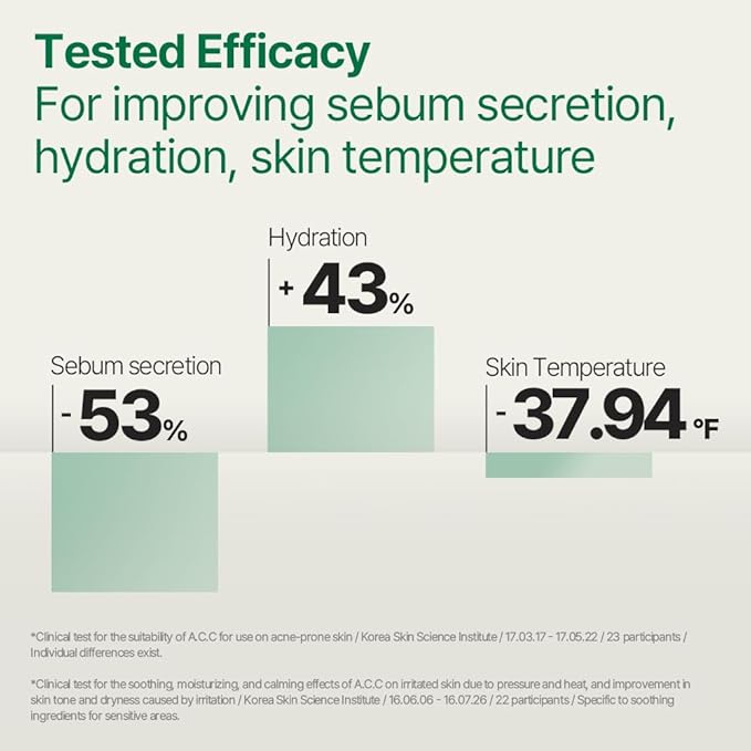 - [Clinically Proven Effects] 53.3% reduction in sebum production, 43.8% increase in hydration, 3.3°C reduction in skin temperature