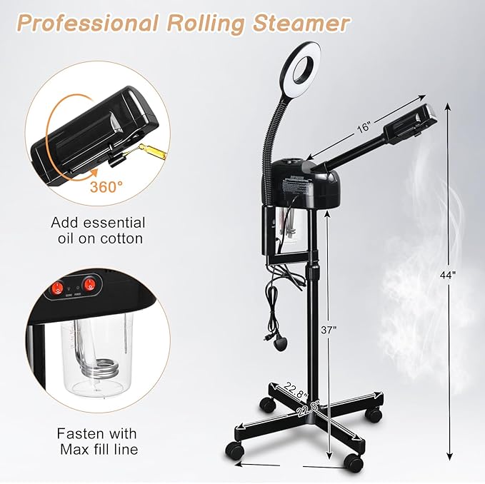 - Adjustable & Flexible: The casters of the beauty tool face steamer will not get stuck on the hair, and the movement is fast and smooth, and you can flexibly adjust the height of the beauty steamer machine and the angle of the beauty lamp when needed.