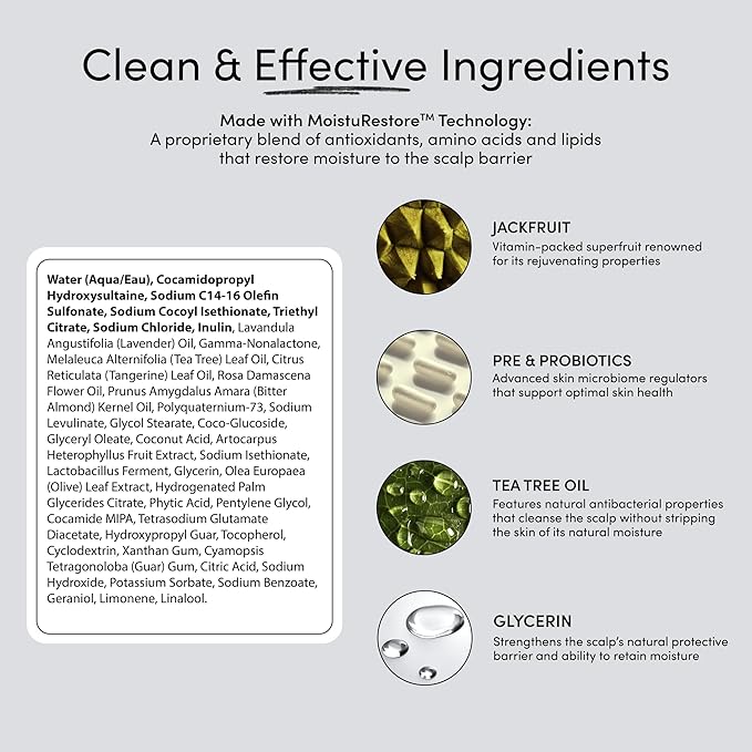 - Clean, Gentle, and Effective: This Vegan, Cruelty-Free, Sulfate-Free formula is perfect for keratin and color-treated hair. Powered by MoistuRestore Technology, it balances pH while hydrating from root to tip. Enriched with Jackfruit, Tea Tree Oil, Pre & Probiotics, and Glycerin, it rejuvenates and strengthens the scalp’s microbiome. A refreshing scent of citrus, florals, and fresh linen adds a spa-like touch.