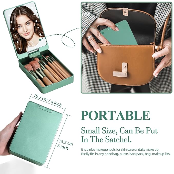 BS-MALL Travel Makeup Brush Set Foundation Powder Concealers Eye Shadows Makeup Set with LED light Mirror 14 Pcs (Green)