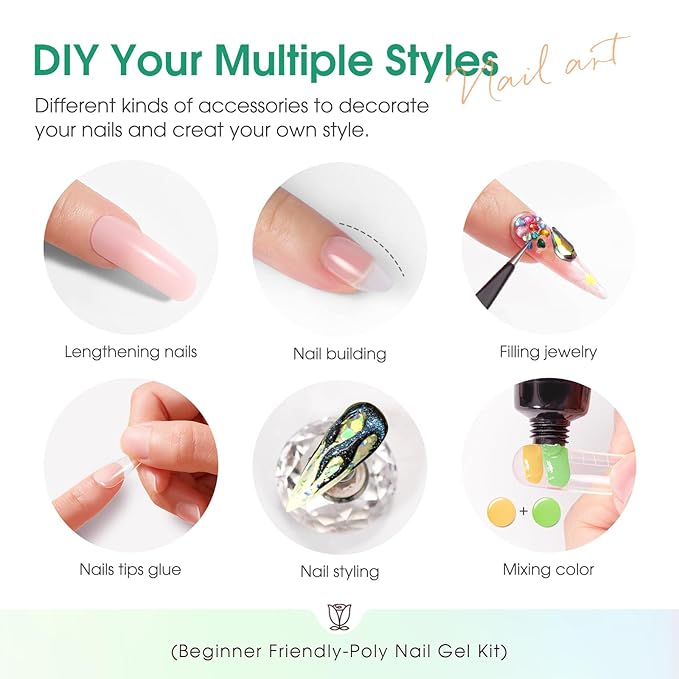 - Customer Service: Our Poly Nail Gel starter kit are brand new and built to last. If you receive an item that is not brand new, or is damaged, defective or missing, please feel free to ask us for help. Wish you happy shopping.