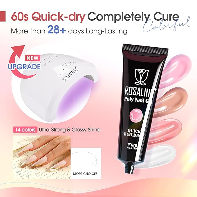 - Fast& Convenient: ROSALIND nail extensions gel kit is a multipurpose object that can be used for the acrylic nail enhancement of natural nails, but also for nail carving, sculpting nails, French nails, 3D nail design decoration, etc.ROSALIND poly nail gel kit is stronger, and more flexible. The poly nail gel kit with UV nail lamp makes your nails look charming and neat.