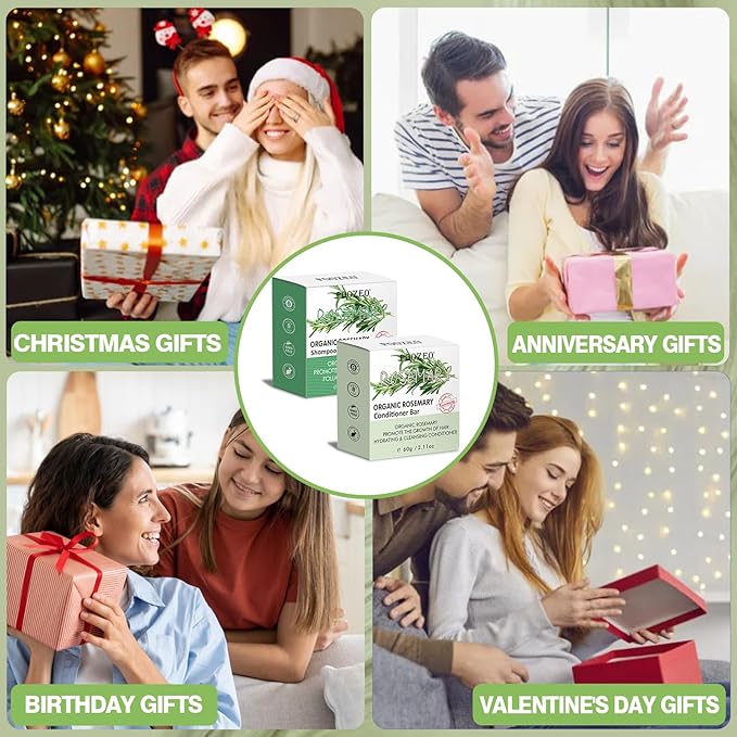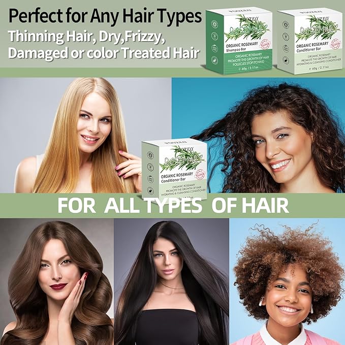 - Rosemary Shampoo and Conditioner Bar Set: Infused with rosemary and Argan Oil, this bar shampoo and conditioner set provides a luxurious lather while adding volume to your hair, making it look fuller and healthier. This rosemary shampoo and conditioner with biotin is ideal for both men and women experiencing thinning hair.