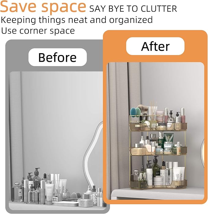 - 【90° Corner Bathroom Counter Organizer】The 90° quarter-circle design maximizes the unused space that snugly fits bathroom/vanity corners. Multi-layer structure adds 100% vertical storage while occupying minimal counter space.