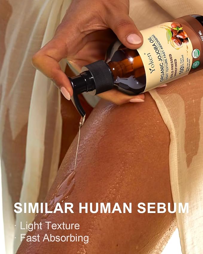 - 100% Organic Jojoba Oil: Yoken jojoba oil is proudly USDA Certified to meet the most rigorous standards and ultimate quality, cold pressed from responsibly grown organic jojoba seeds, extra virgin, and unrefined. Single Ingredient Oil, Chemical Free