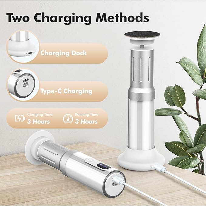- Dual charging mode: The foot file electric has LCD icon to indicate battery level, you can charge directly using the Type-C charging port on the electric foot filer, or place the foot grinder on the charging dock(charging pin connect) for charging.