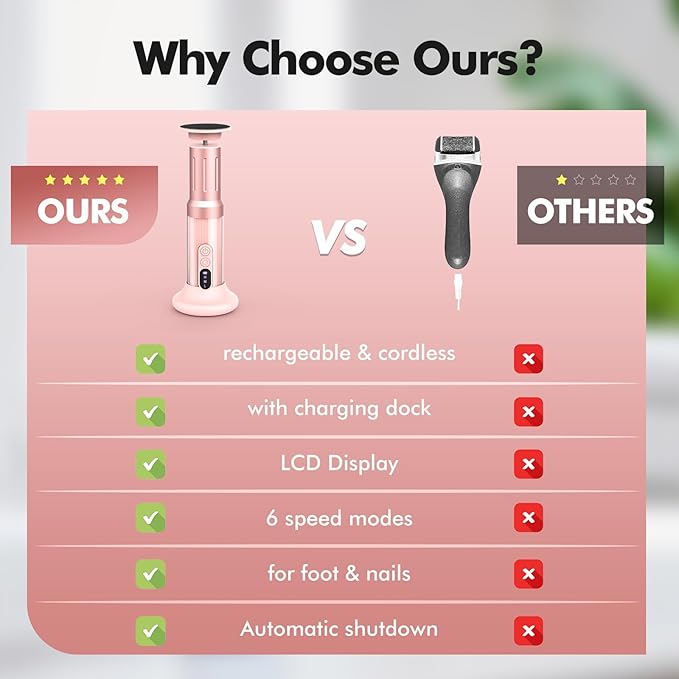- Dual charging mode: The foot file electric has LCD icon to indicate battery level, you can charge directly using the Type-C charging port on the electric foot filer, or place the foot grinder on the charging dock(charging pin connect) for charging.