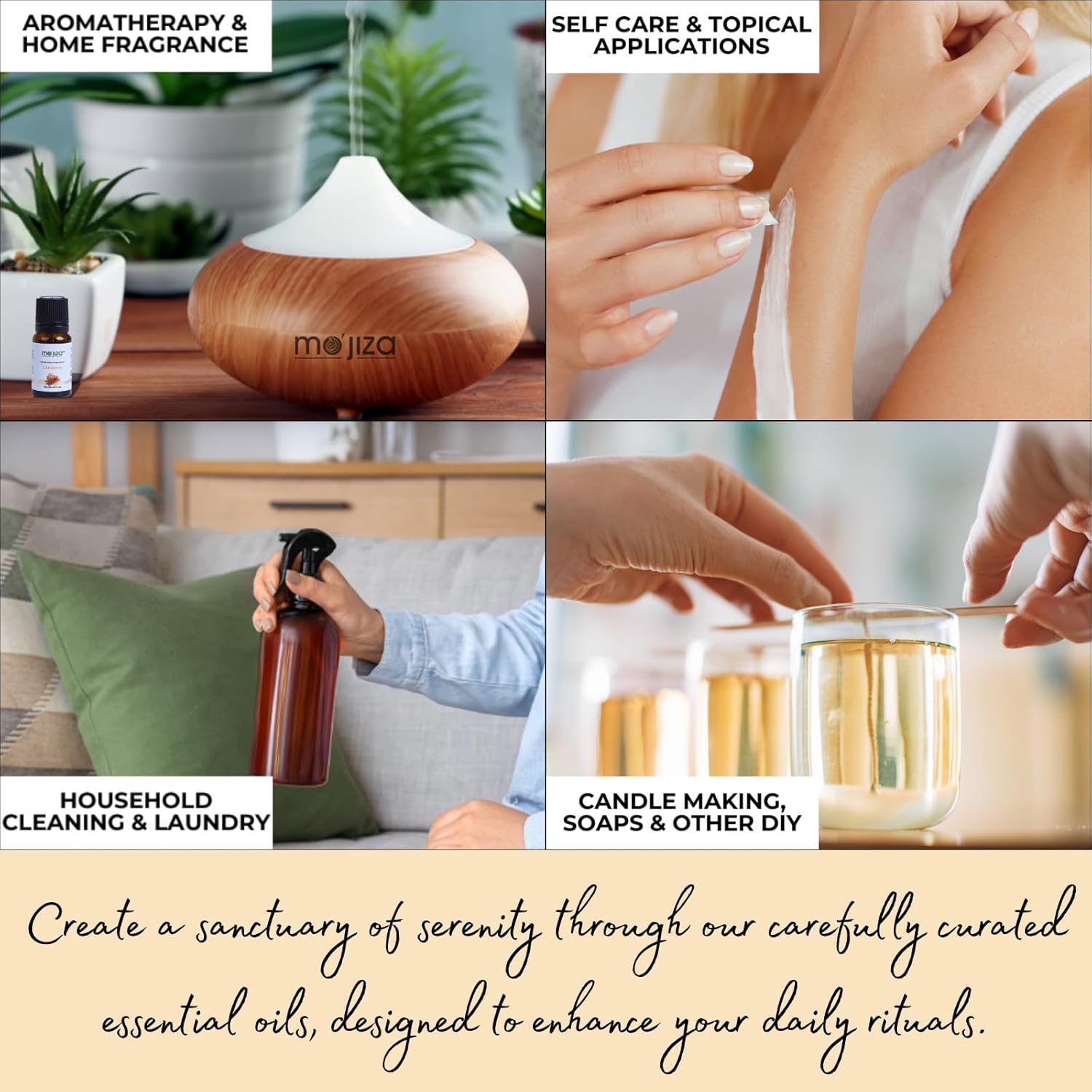 - AROMATHERAPY & NATURAL WELLNESS IN EVERY BOTTLE: Whether you're looking to relax, recharge, or refocus, MO'JIZA Essential Oils support your wellness journey. Their versatility makes them ideal for diffusers, massages, skincare and haircare routines, and DIY creations. An included booklet offers helpful tips on each oil and how to use them effectively.