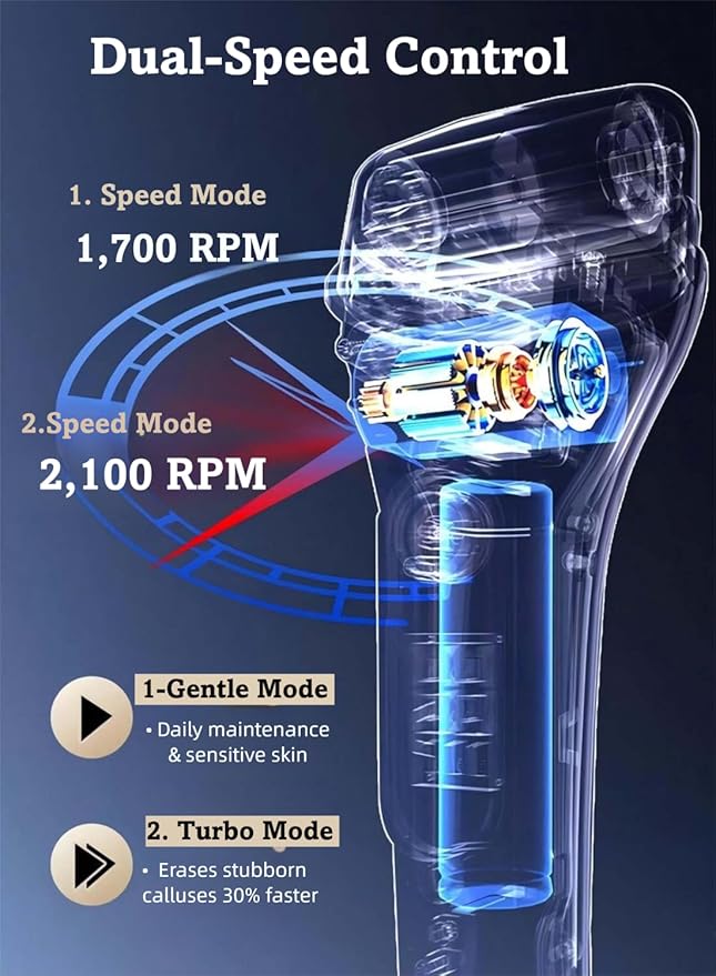 - [Safe & Powerful & 2-Speed Adjustable] Experience a smooth and safe foot care routine with our electric foot callus remover. Featuring 3 different grinding heads and 2 adjustable speeds—1700 RPM for gentle use and 2100 RPM for dead duty skin —this pedicure tools is perfect for tackling various types of hard skin and calluses.