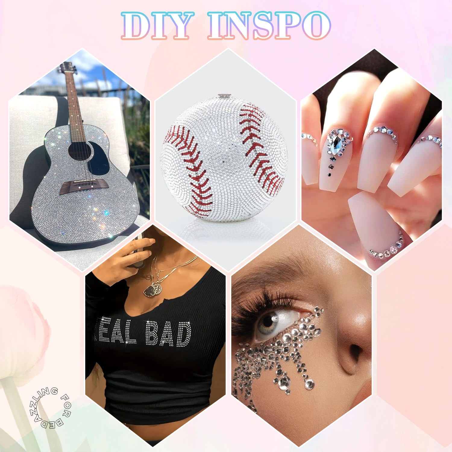 - PACKAGE CONTENT – This all-in-one bedazzler kit includes everything you need to start creating dazzling designs: 1 box of Clear rhinestones with 24 grids (approx. 30,000 pcs of bedazzling rhinestones assorted size SS6/10/16/20/30 ), 1 precision tweezers, 1 pickup pen for handling small gems, and 3 tubes of B7000 jewelry glue for secure application.