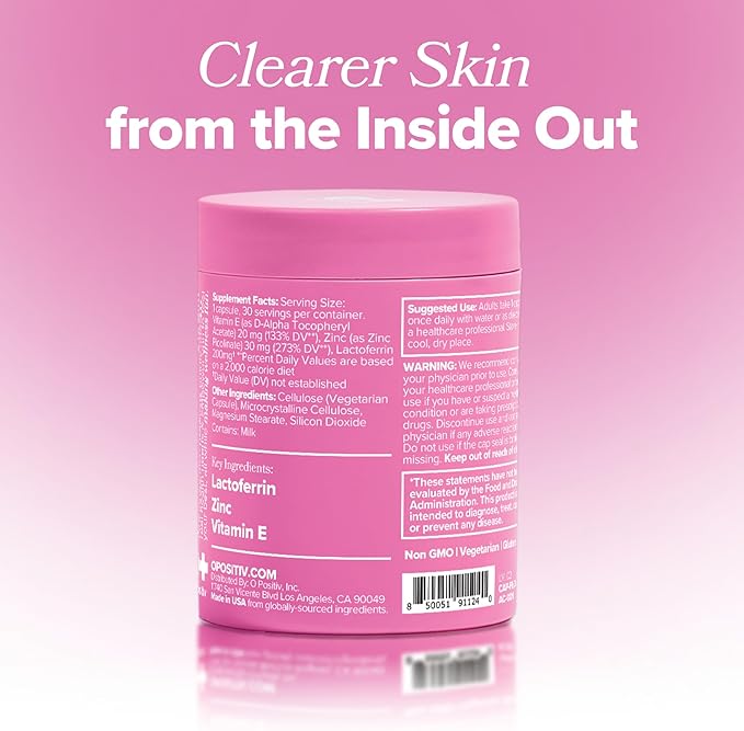 O Positiv FLO Acne Capsules – Reduce Number and Severity of Pimples, Whiteheads, Blackheads, and Pustules on Face, Back, and Body – Colostrum-Derived Lactoferrin, Zinc and Vitamin E – 30 Servings