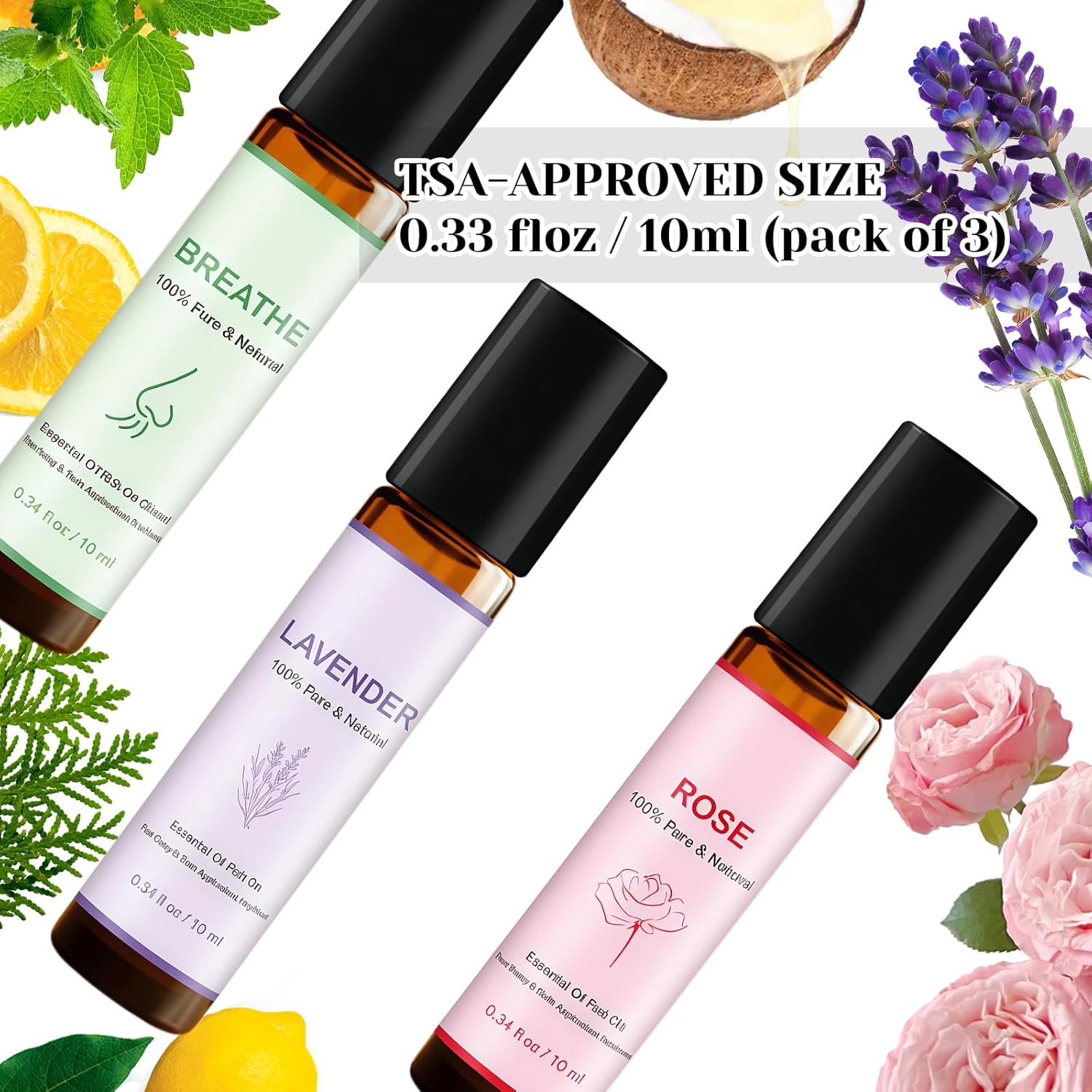 - PACK OF 3 ESSENTIAL OIL SETS PERFECT FOR GIFTING : Discover the ultimate relaxation trio with our blend essential oil roll on set, including Lavender(Relaxation), Rose(Uplifting), and Breathe( Clear Breathing) blends, each packaged in a convenient 10ML roller bottle. Packaged in an elegant gift box, this set makes the perfect present for friends, family, or yourself. Self care gifts for women.