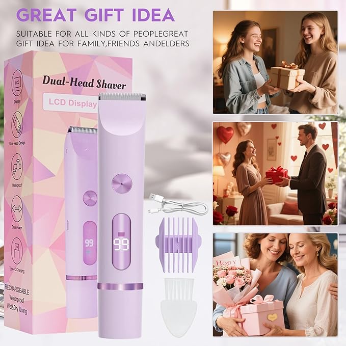 2025 Upgraded Dermave Bikini Shaver - 2 in 1 Bikini Trimmer for Women with LCD Display, Dual Head Cordless Electric Shaver, IPX7 Waterproof Wet/Dry Body Hair Trimmer for Face,Purple